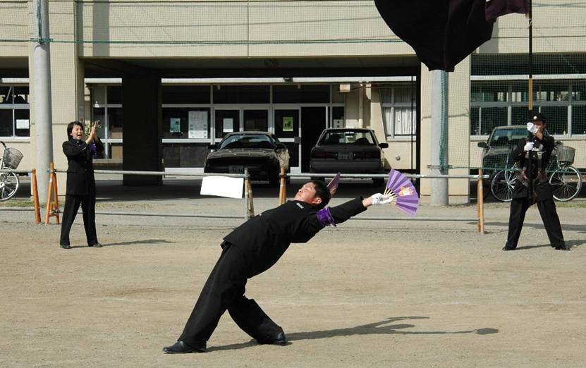 ![]() 必勝の拍手 リーダーの後ろへ体重をかけ、伸びた姿勢が良い、 扇子がいっぱいに開いていれば完璧 バックの姿勢、足の開き、 口の開け方、声だし良し 旗手の姿勢も良い |